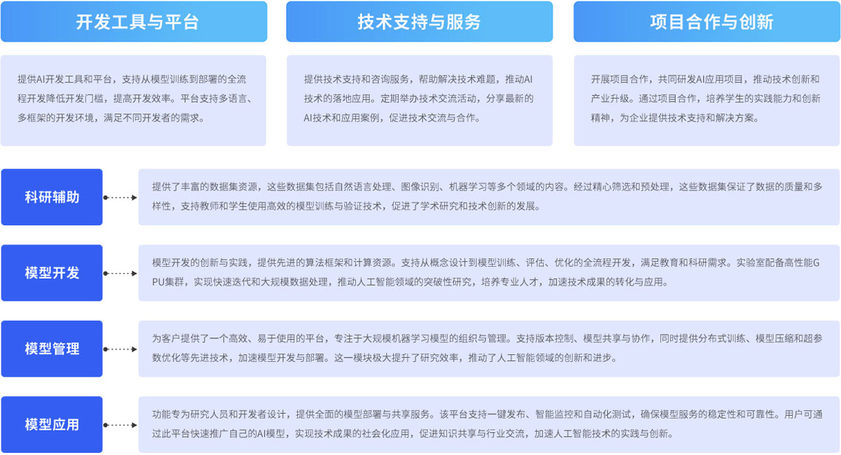 通过整合各类异构、多层级的算力资源,面向AIGC、大语言模型推理、模型精调等主流应用场景,提供开箱即用的一站式人工智能开发平台。结合人工智能课程体系,让学生学到知识点及实操经验。